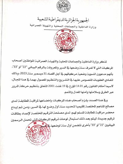 أصحاب المركبات التي لا تعرف سنة وضعها في السير مدعوون الى تسوية وضعيتهم قبل 31 ديسمبر 2023 19 يونيو 2023 الوطني اضف تعليق 725 زيارة شاركها Facebook Twitter Google + مقالات مشابهة شارك فيها 52 ممثلا عن مختلف القطاعات الوزارية:اختتام الجلسات الخاصة بمتابعة الإستراتيجية الوطنية للشفافية والوقاية من الفساد ومكافحته 21 يناير 2026 خلال يوم دراسي حول "رمضان والصحة": وزارة الصحة تؤكد التزامها بتعزيز الوقاية وضمان الولوج إلى الخدمات الصحية 21 يناير 2026 على إثر التقلبات الجوية:الحماية المدنية تؤكد التجند التام عبر أكثر من 20 ولاية وتدعو إلى توخي الحيطة والحذر 21 يناير 2026 main_post 2023-06-19 bouskine boubakeur شاركها Facebook Twitter Google +