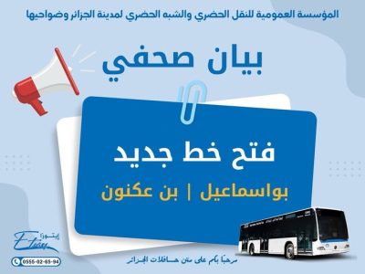 ستطلق مؤسسة النقل الحضري وشبه الحضري للجزائر العاصمة وضواحيها “إيتوزا” خطا جديدا يربط مدينة بواسماعيل ببن عكنون مرورا بمحطة القطار زرالدة, وهذا ابتداء من يوم الأحد المقبل, وفق ما أكدته المؤسسة اليوم في بيان لها.