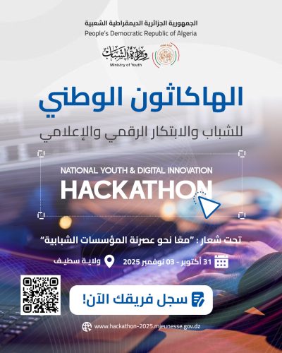 ودعت الوزارة في هذا الإطار “كل شاب جزائري موهوب ومهتم بالمجال الرقمي أو الإعلامي إلى المبادرة بالتسجيل والمشاركة في هذه التظاهرة الوطنية التي نمضي من خلالها نحو مستقبل أكثر حداثة وفعالية للمؤسسات الشبابية”، وذلك عبر التسجيل على الموقع الرسمي للوزارة من خلال الرابط :https://hackathon-2025.mjeunesse.gov.dz/.