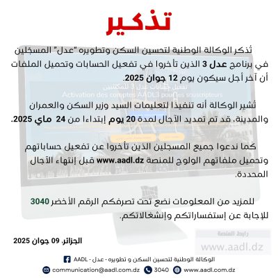 بيان هام للمسجلين في برنامج عدل 3 9 يونيو 2025 الوطني اضف تعليق 224 زيارة شاركها Facebook Twitter Google + مقالات مشابهة صندوق "كاكوبات" :إطلاق حملة إعلامية حول خدمة الاقتطاع الآلي لاشتراكات الضمان الاجتماعي 14 يناير 2026 اللجنة الوطنية التنسيقية لمتابعة الابتكار وحاضنات الأعمال الجامعية:تسطير هدف بلوغ إدماج أكبر عدد ممكن من خريجي الجامعات في مسار المقاولاتية 14 يناير 2026 ترأس اجتماعا تقييميا حول نشاط "كناص":وزير العمل يؤكد على تحسين جودة الخدمة العمومية المقدمة للمواطن 14 يناير 2026 main_post 2025-06-09 bouskine boubakeur شاركها Facebook Twitter Google +