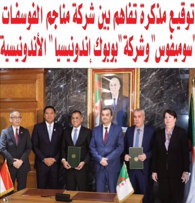 وجاء في بيان وزارة المحروقات والمناجم، أن وزير الدولة عرقاب أشرف، أمس، بمقر الوزارة، على مراسم التوقيع على مذكرة تفاهم بين شركة مناجم الفوسفات الجزائرية “سوميفوس” (SOMIPHOS)، فرع مجمع سونارام، وشركة “بوبوك إندونيسيا (Pupuk Indonesia)، وذلك بحضور نائب وزير الفلاحة لجمهورية إندونيسيا، سوداريونو، وكاتبة الدولة لدى وزير المحروقات والمناجم، المكلفة بالمناجم، كريمة بكير طافر، وسعادة سفير جمهورية إندونيسيا لدى الجزائر، إلى جانب عدد من إطارات ومسؤولي الجانبين.