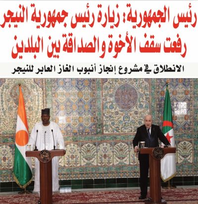 ولفت رئيس الجمهورية إلى ان زيارة رئيس جمهورية النيجر الى الجزائر “رفعت سقف الأخوة والصداقة بيننا كجيران، إخوة وأصدقاء، وقد اتفقنا على كل ما كان يدور بيننا من تعاون أمني وطاقوي يشمل المحروقات والكهرباء، فضلا عن التعاون في مجال التكوين المهني, التكوين العسكري والتكوين الجامعي“.