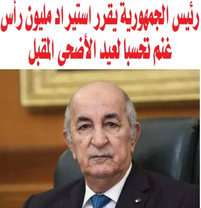 قرر رئيس الجمهورية، عبد المجيد تبون، استيراد مليون رأس غنم تحسبا لعيد الأضحى المقبل، حسبما أعلن عنه الوزير الأول، سيفي غريب، لدى ترؤسه اجتماعا للحكومة أمس.