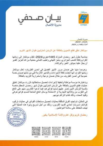 سونلغاز تعلق قطع التموين بالطاقة عن زبائنها طوال شهر رمضان 6 مارس 2024 الوطني اضف تعليق 403 زيارة شاركها Facebook Twitter Google + مقالات مشابهة صندوق "كاكوبات" :إطلاق حملة إعلامية حول خدمة الاقتطاع الآلي لاشتراكات الضمان الاجتماعي 14 يناير 2026 اللجنة الوطنية التنسيقية لمتابعة الابتكار وحاضنات الأعمال الجامعية:تسطير هدف بلوغ إدماج أكبر عدد ممكن من خريجي الجامعات في مسار المقاولاتية 14 يناير 2026 ترأس اجتماعا تقييميا حول نشاط "كناص":وزير العمل يؤكد على تحسين جودة الخدمة العمومية المقدمة للمواطن 14 يناير 2026 main_post 2024-03-06 bouskine boubakeur شاركها Facebook Twitter Google +