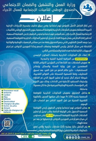 “كناص”يصدربيانا هاما لفائدة المؤمن لهم اجتماعيا وذوي الحقوق زارعي القوقعة السمعية 16 فبراير 2025 الوطني اضف تعليق 219 زيارة شاركها Facebook Twitter Google + مقالات مشابهة وزير العدل حافظ الأختام لطفي بوجمعة::القانون الأساسي للقضاء يأتي في إطار تجسيد التزامات رئيس الجمهورية لترقية العدالة وتعزيز مكانة السلطة القضائية 13 يناير 2026 وكالة "ناسدا":إطلاق حملة لترقية الفكر المقاولاتي لدى خريجي المعاهد المتخصصة في التكوين والتعليم المهنيين 13 يناير 2026 بالشراكة مع الديوان الوطني لحقوق المؤلف والحقوق المجاورة:وزير الاتصال يشرف على افتتاح يوم دراسي حول حق المؤلف في الإعلام العصري 13 يناير 2026 main_post 2025-02-16 bouskine boubakeur شاركها Facebook Twitter Google +