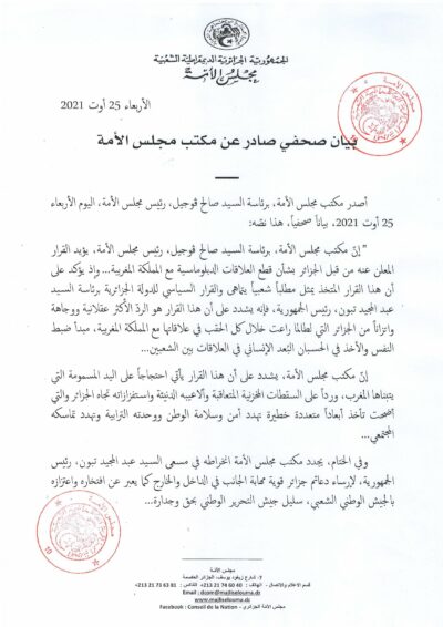 أعرب مجلس الأمة، اليوم الأربعاء عن تأييده للقرار المعلن من قبل الجزائر بشأن قطع العلاقات الدبلوماسية مع المغرب، معتبرا إياه ردا على “السقطات المخزنية المتعاقبة واستفزازاته تجاه الجزائر”، حسب ما أفاد به بيان للمجلس.