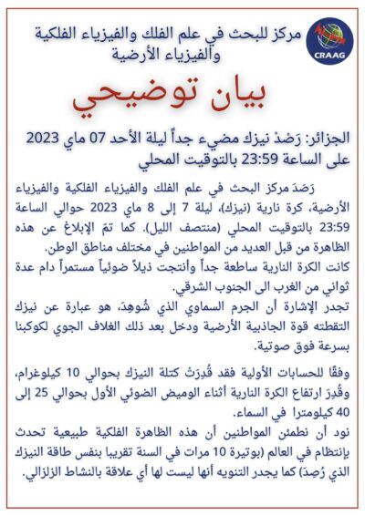 مركز ” كراغ” يصدر بيانا توضيحيا بخصوص رصد “نيزك مضيئ جدا” ليلة الأحد 7 ماي 9 مايو 2023 الحدث اضف تعليق 900 زيارة شاركها Facebook Twitter Google + مقالات مشابهة حسب بيان للرئاسة:رئيس الجمهورية يستقبل الأمير عبد العزيز بن سعود 19 يناير 2026 رئيس الجمهورية يستقبل صاحب السمو الملكي الأمير عبد العزيز بن سعود 19 يناير 2026 وزير المجاهدين: قانون تجريم الاستعمار يؤكد أن الجزائر المنتصرة لا تساوم على ذاكرتها الوطنية 19 يناير 2026 main_post 2023-05-09 bouskine boubakeur شاركها Facebook Twitter Google +