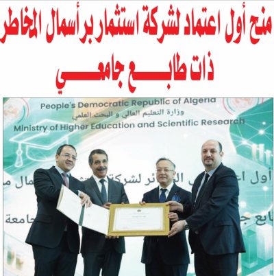 وبهذه المناسبة تم إصدار بيان صحفي مشترك، تضمن إعلان لجنة تنظيم عمليات البورصة ومراقبتها “منح أول اعتماد في الجزائر لشركة استثمار برأسمال المخاطر ذات طابع جامعي لفائدة جامعة الجزائر 3، برأسمال قدره 188،8 مليون دج، في سابقة وطنية تأتي عقب صدور الإطار التنظيمي الخاص بهيئات التوظيف الجماعي برأسمال المخاطر“، وتعكس توجه الدولة نحو “بناء اقتصاد قائم على المعرفة ودعم الابتكار من داخل الوسط الجامعي“.