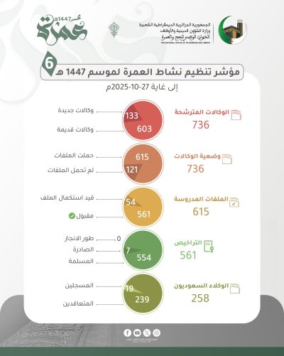 منح الترخيص ل 561 وكالة سياحة وأسفار لتنظيم نشاط العمرة 28 أكتوبر 2025 الوطني اضف تعليق 58 زيارة شاركها Facebook Twitter Google + مقالات مشابهة الخطوط الجوية الجزائرية:إطلاق خطين جديدين يربطان الجزائر بغوانزو الصينية وروتردام بهولندا 28 أكتوبر 2025 الصالون الدولي للكتاب بالجزائر: إيتوزا تبرمج رحلات خاصة لنقل الزوار من وإلى قصر المعارض 28 أكتوبر 2025 في ندوة بمناسبة الذكرى الـ71 لاندلاع ثورة التحرير المجيدة واسترجاع السيادة الوطنية على الإذاعة والتلفزيون :بوغالي: الإعلام الوطني حاضن للذاكرة وصائن للسيادة والهوية 27 أكتوبر 2025 main_post 2025-10-28 bouskine boubakeur شاركها Facebook Twitter Google +