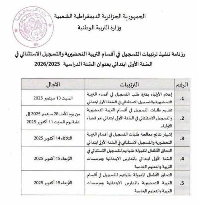 هذه رزنامة التسجيل في أقسام التربية التحضيرية و السنة الأولى إبتدائي 14 سبتمبر 2025 الوطني اضف تعليق 219 زيارة شاركها Facebook Twitter Google + مقالات مشابهة وزارة البريد والمواصلات السلكية واللاسلكية:نحو إدماج الشريحة الإلكترونية (eSIM) ضمن باقات الخدمات 14 أكتوبر 2025 بين وزارتي الداخلية والسكن:إجتماع تنسيقي لضبط قوائم البرنامج السكني المزمع توزيعه بمناسبة الذكرى الـ71 لاندلاع الثورة التحريرية المجيدة 14 أكتوبر 2025 تستمر إلى غاية يوم الثلاثاء 18 نوفمبر :انطلاق المراجعة الدورية للقوائم الانتخابية الاثنين المقبل 14 أكتوبر 2025 main_post 2025-09-14 bouskine boubakeur شاركها Facebook Twitter Google +