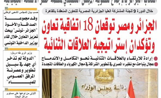 إرادة للارتقاء بالعلاقات الثنائية نحو التكامل والاندماج انعقدت أمس، الدورة التاسعة للجنة المشتركة العليا الجزائرية المصرية للتعاون بالعاصمة المصرية القاهرة، ترأسها كل من الوزير الأول سيفي غريب، ورئيس مجلس الوزراء المصري، مصطفى مدبولي، وتم توقيع خلالها على 18 اتفاقية ومذكرة تفاهم وبرامج التعاون، تغطي قطاعات الداخلية والمالية والطاقة والصناعة والتجارة والسكن …