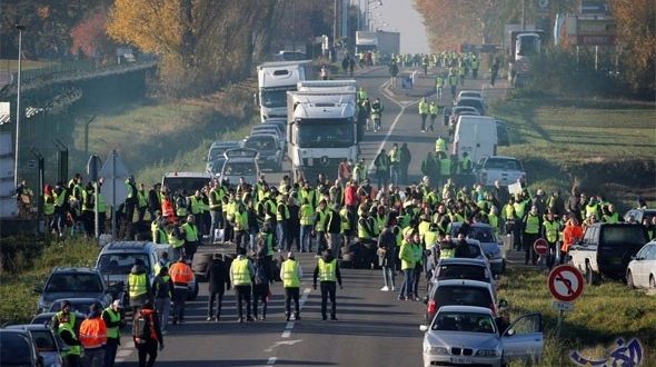 تمكن صباح اليوم، آلاف المتظاهرين من الوصول إلى باحة الشانزليزيه وسط العاصمة الفرنسية باريس، مما أدى إلى مواجهات عنيفة مع عناصر الشرطة الفرنسية التي استخدمت الغازات المسيلة للدموع ومدافع المياه لتفريق المحتجين. وغنى بعض المحتجين المناهضين للسياسات الإقتصادية للرئيس الفرنسي وارتفاع تكاليف الوقود، النشيد الوطني الفرنسي بينما حمل آخرون لافتات تحمل شعارات …